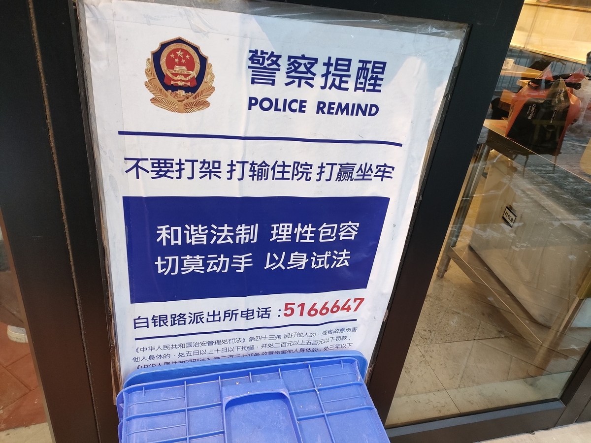 お店の前にあった面白い標語「不要打架 打输入院 打赢坐牢」。それっぽく訳すなら「喧嘩はやめよう 負けたら入院 勝っても刑務所」とか…?
